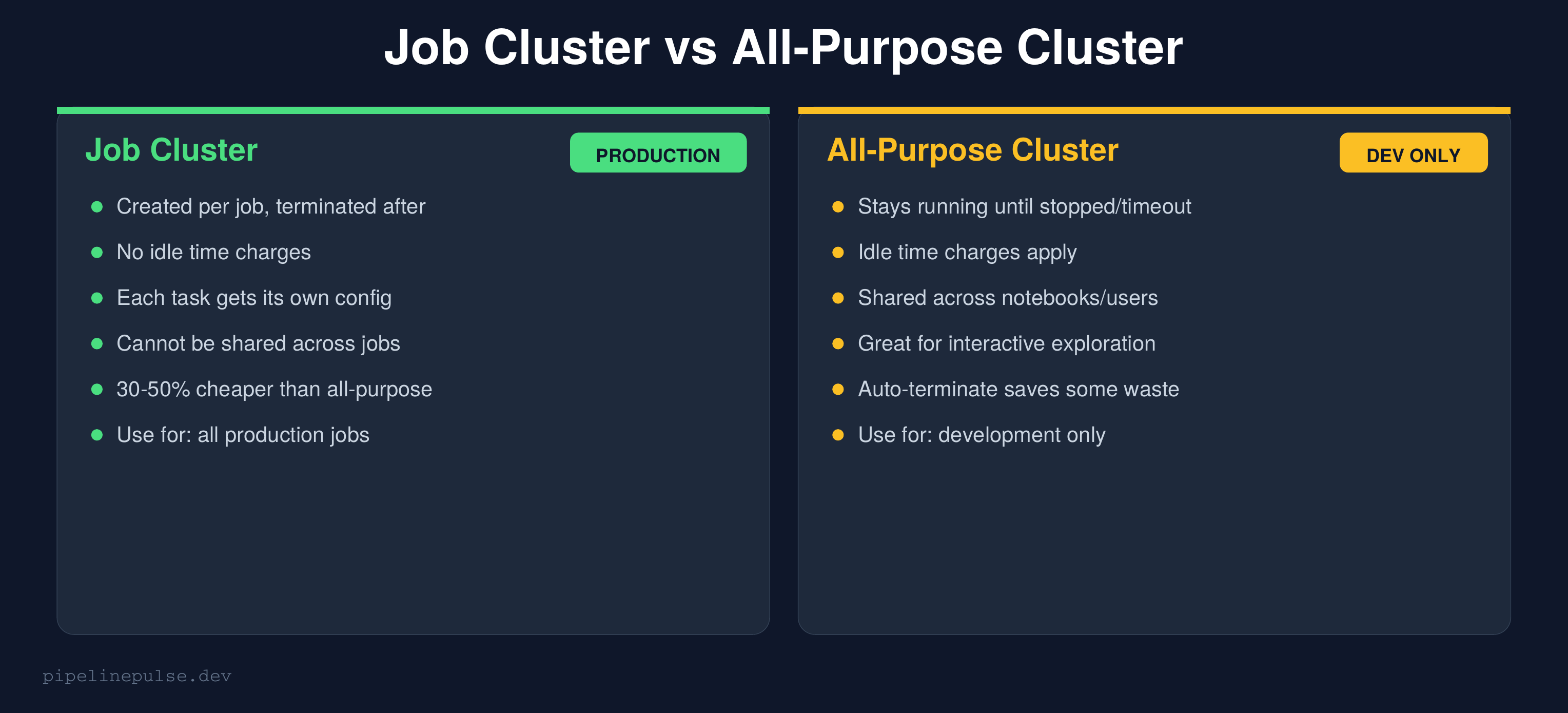 The rule: All-purpose clusters are for interactive development only. Every scheduled job should use a job cluster. If you make this one change and do nothing else, you'll likely see 30-50% savings.