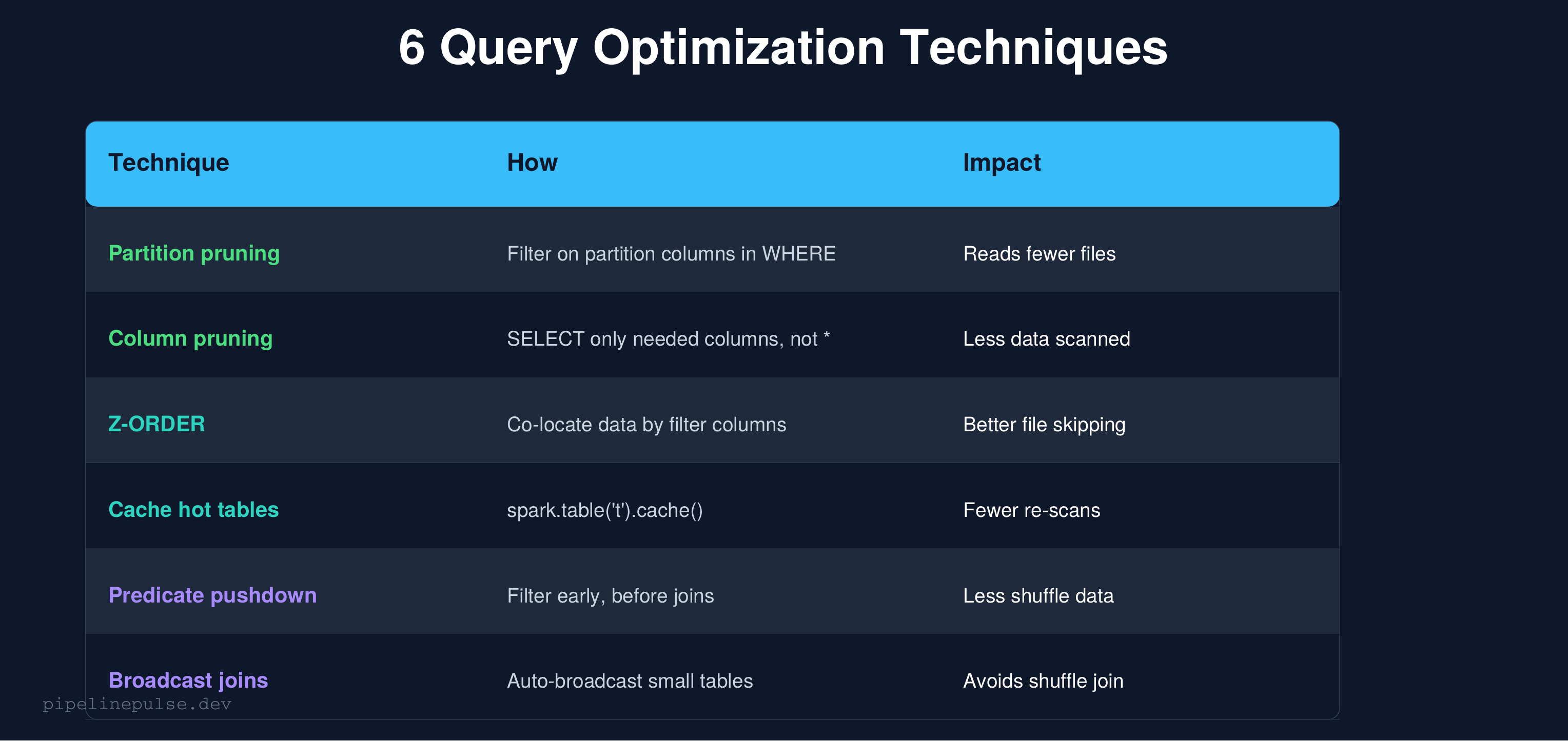 Delta Lake stores data in columnar format (Parquet). SELECT * reads every column from disk, even if you only need 3. On a table with 50 columns, you're reading 16x more data than necessary.