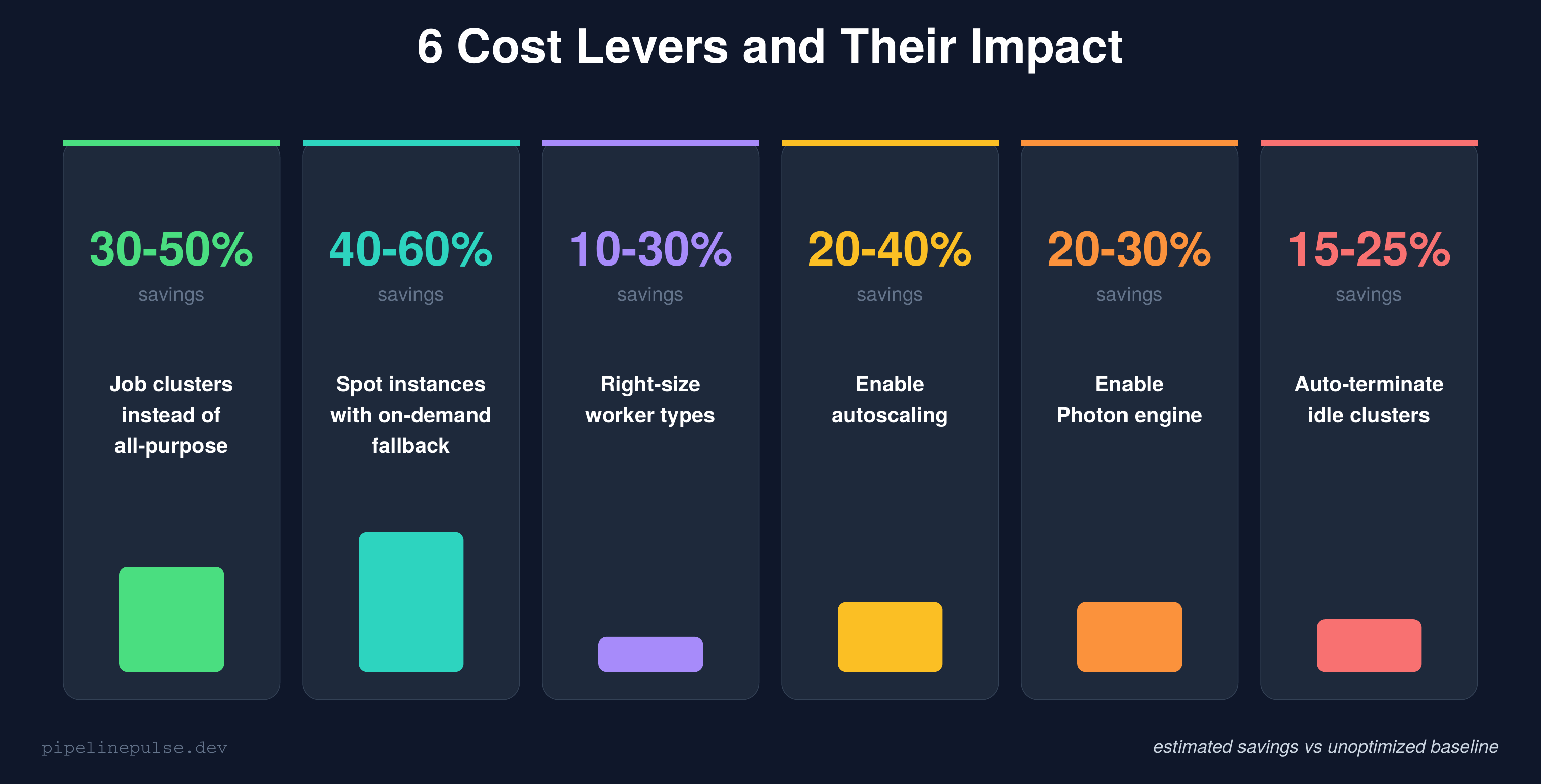 1. Use Job Clusters, Not All-Purpose (30-50% savings)